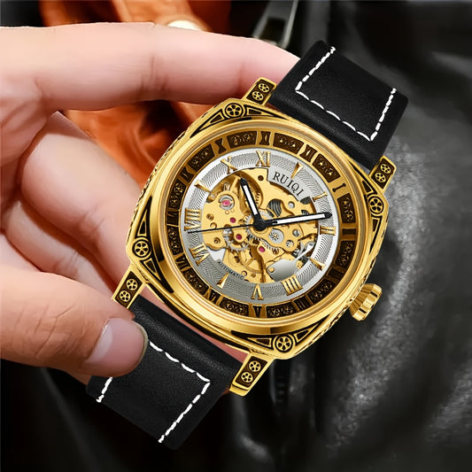 RUIQI Luxury Vintage Automatic Watch - Golden Hollow Skeleton Roman Numerals