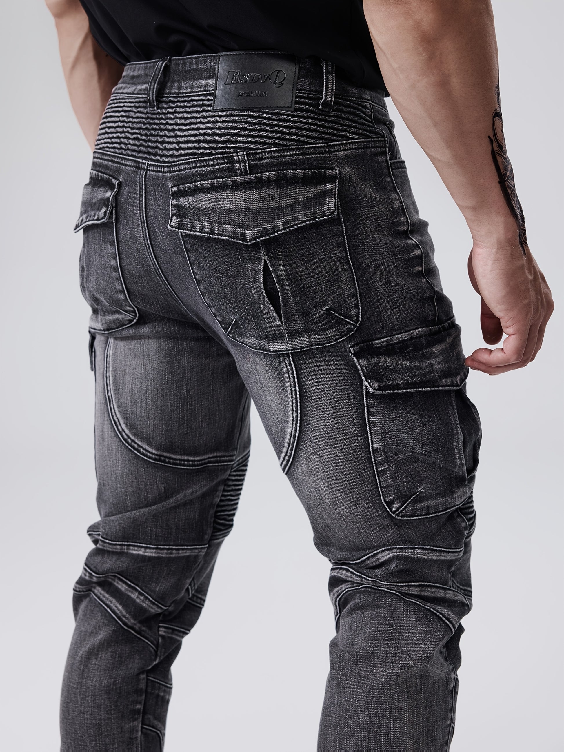 ESDVQ Men's Stretch Slim Multi-Pocket Jeans - Locomotive Stitching