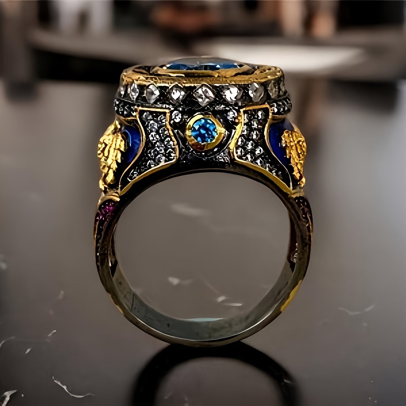 Vintage-Kriegerring, Doppeladler-Design, dunkelblaue Emaille-Elemente, Ring mit synthetischen Edelsteinen, Herrenring im Vintage-Stil, Granat-Imitat