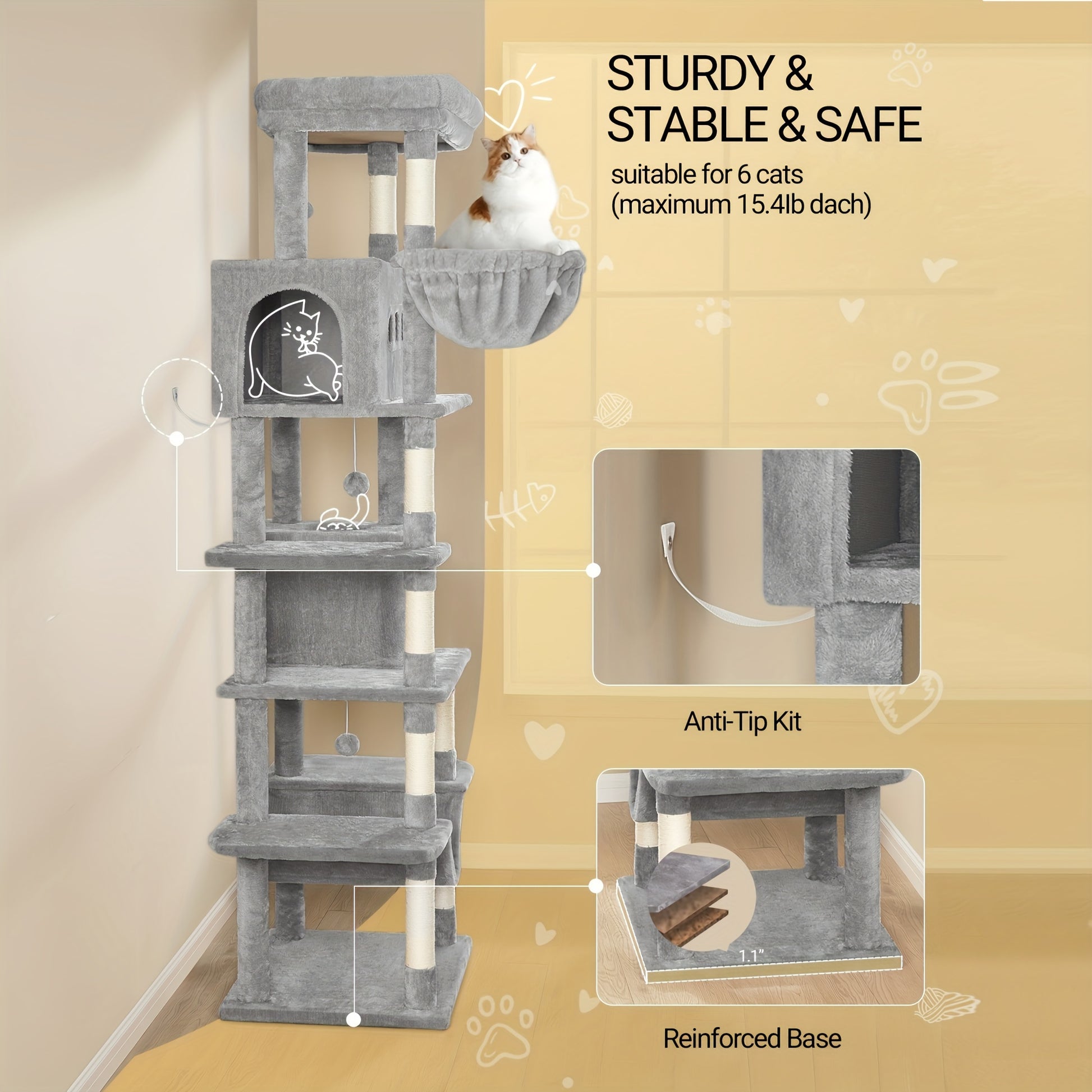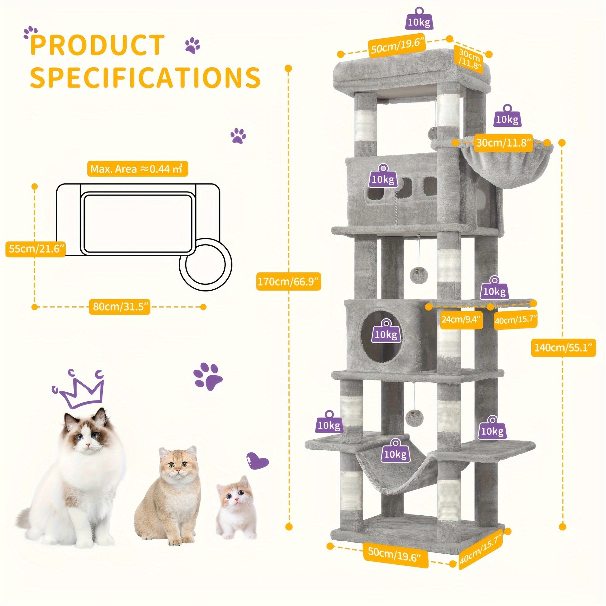 Features: Large Perch, 8 Scratching Posts, 2 Caves, Washable Mat