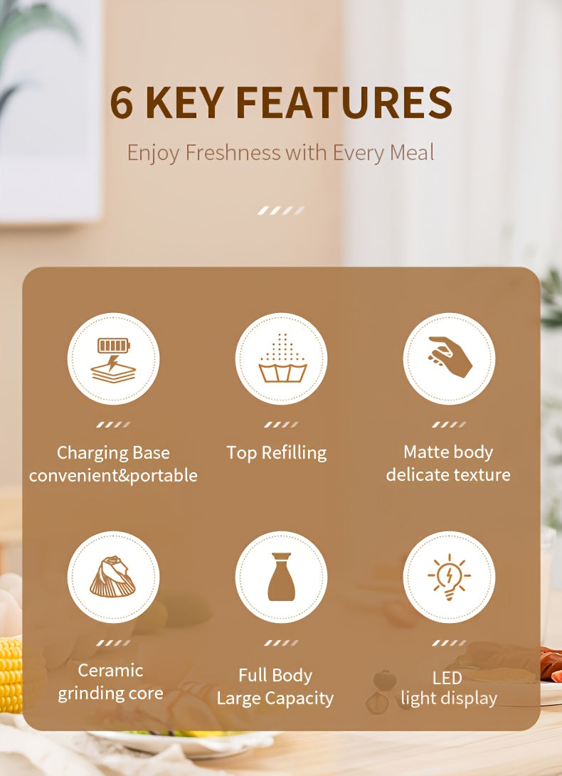 Effortless seasoning with Electric Salt & Pepper Grinder! ⚡ Featuring rechargeable USB design, top-refill automatic operation, adjustable coarseness, LED light, and larger capacity for easy filling.