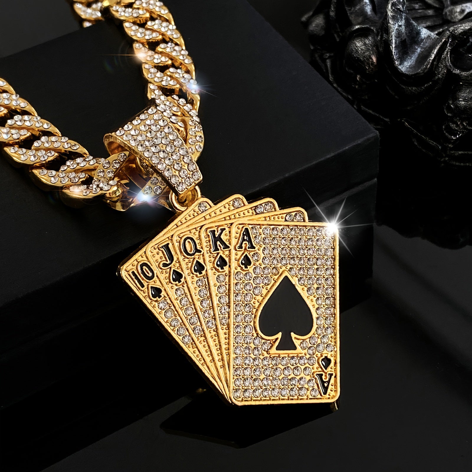 Fashionable statement with 1pc Poker Pendant + Cuban Chain! 🃏 Featuring poker pendant design, Cuban chain included, golden color, zinc alloy construction, rhinestone mosaic, 18K gold plated finish, geometric patterns, and perfect for fashionable style with non-magnetic design.