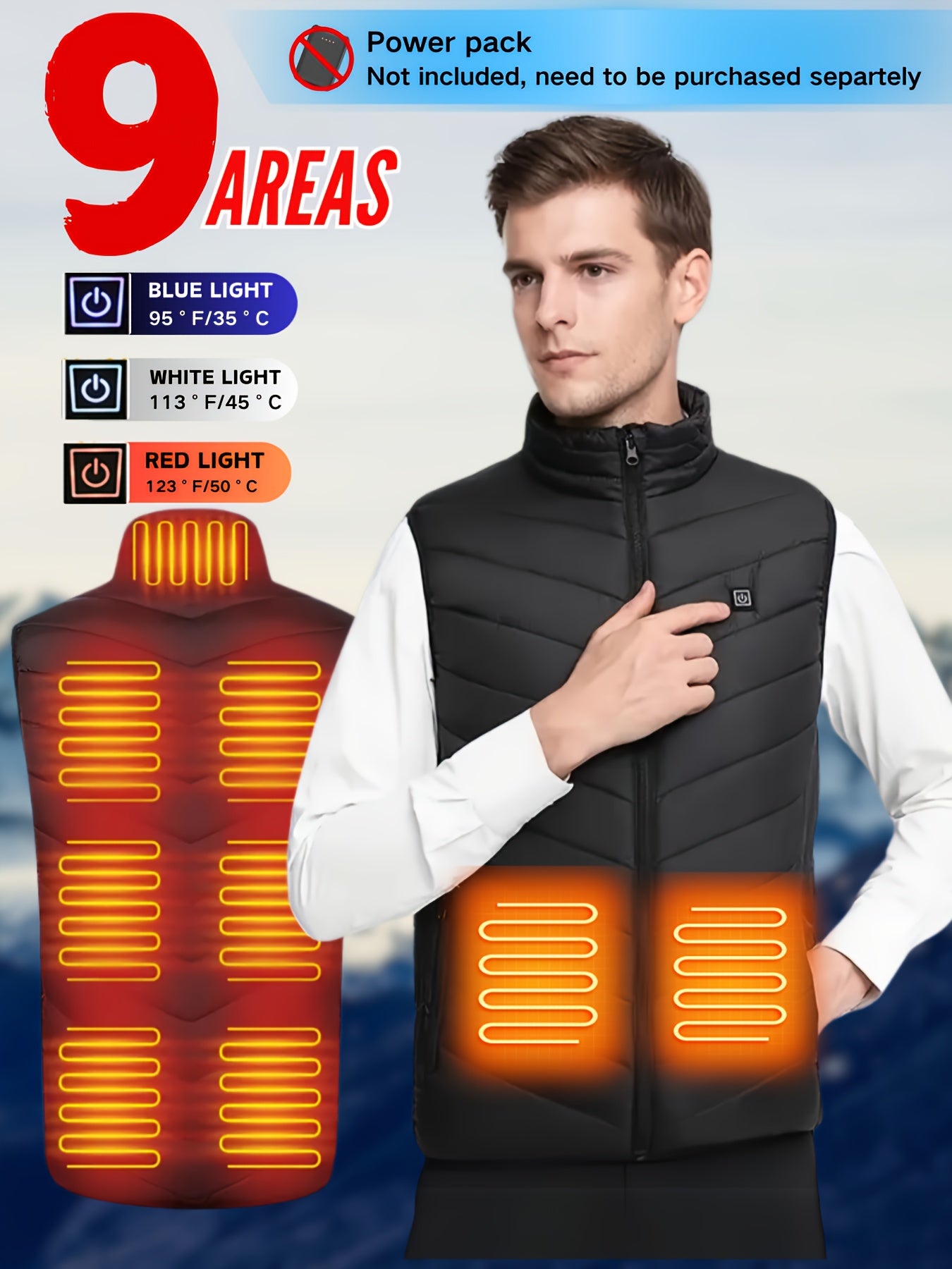 Portable warmth with 9-Zone Heated Vest! 🔥 Featuring USB-powered design, adjustable heating with 3 temperature settings, durable polyester, sleeveless design, stand collar, and suitable for outdoor activities, camping, and hiking in fall and winter.