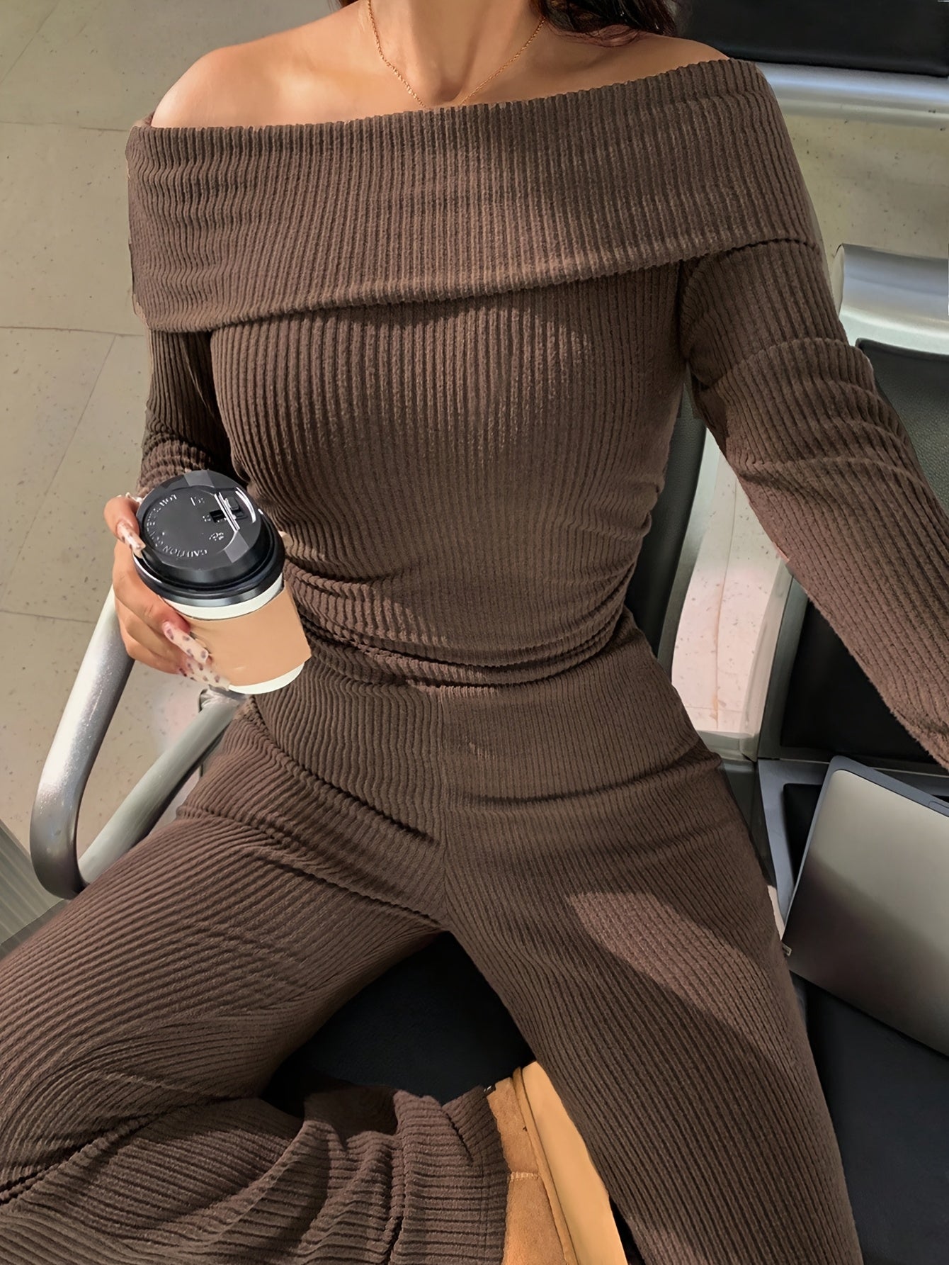 Stylish comfort with Women's 2pcs Set! 👗 Featuring sexy V-neck top and wide-leg flare pants, stretchy soft ribbed fabric, solid color design, and 95% polyester with 5% elastane for autumn and winter.