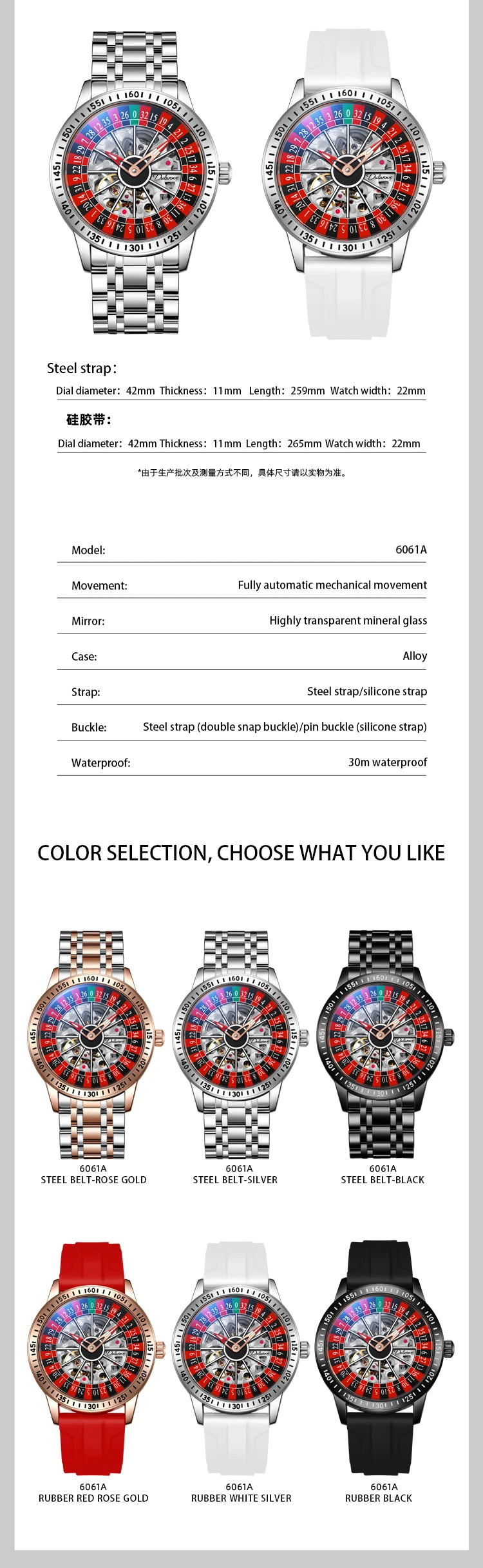 Discover the captivating DULUNWE Roulette Automatic Watch! This exceptional mechanical timepiece features a mesmerizing spinning roulette dial that combines casino-inspired design with precision engineering. The automatic movement harnesses your natural wrist motion to power the watch - no battery ever needed!
