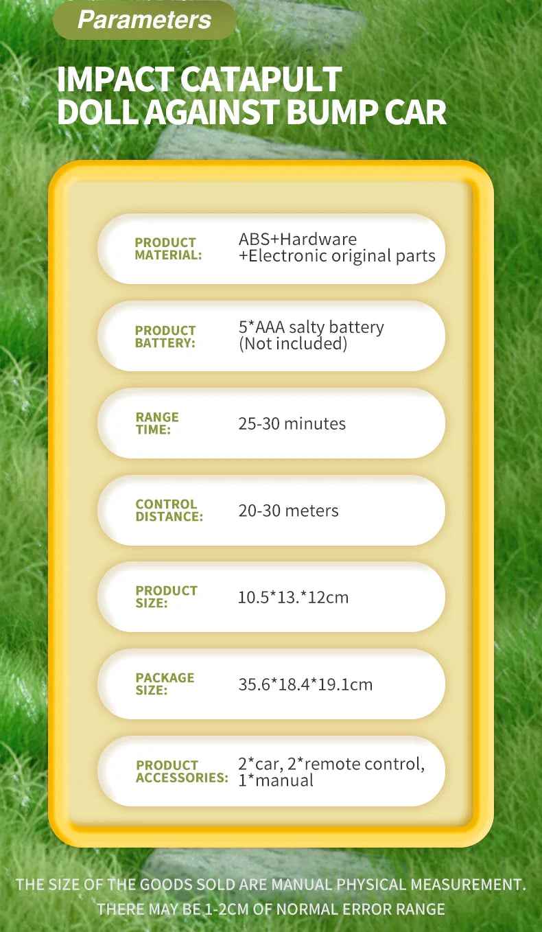 Get ready for epic car battles! 🚀 CrashMasters are the ultimate duo remote control bumper cars for kids. Smash, crash, and bounce 🚗💥 with pop-up dolls and ejection action 🪂 for hours of non-stop fun! Bright lights ✨ and speedy movement make every race thrilling, while durable design ensures safe play for children 🎯. Perfect for competitive fun at home or with friends 🏠👫. Let the battle begin! 🎉
