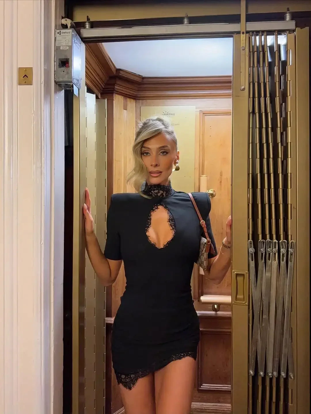 Lady Black Lace Hollow Out Mini Dress Women Elegant Short Sleeve High Collar Slim Dresses 2025 Fashion Evening Party Wares