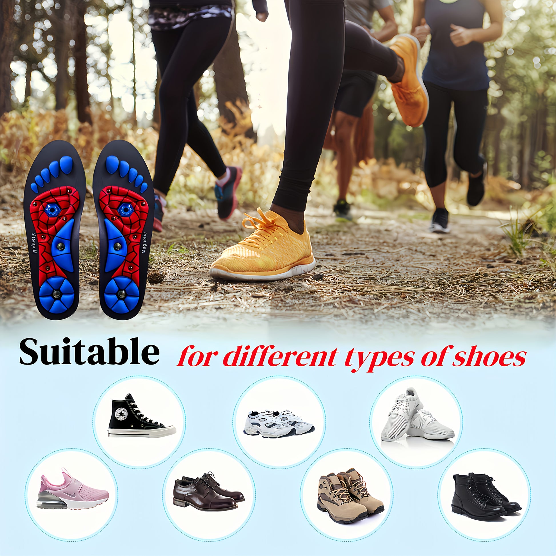 Comfortable foot care with Magnetic Acupoint Massage Insole! 👣 Featuring soft elastic EVA material, arch support and shock absorption, breathable non-slip design, ergonomic cuttable construction, unisex sizing, and perfect for comfortable massage experience and foot health.