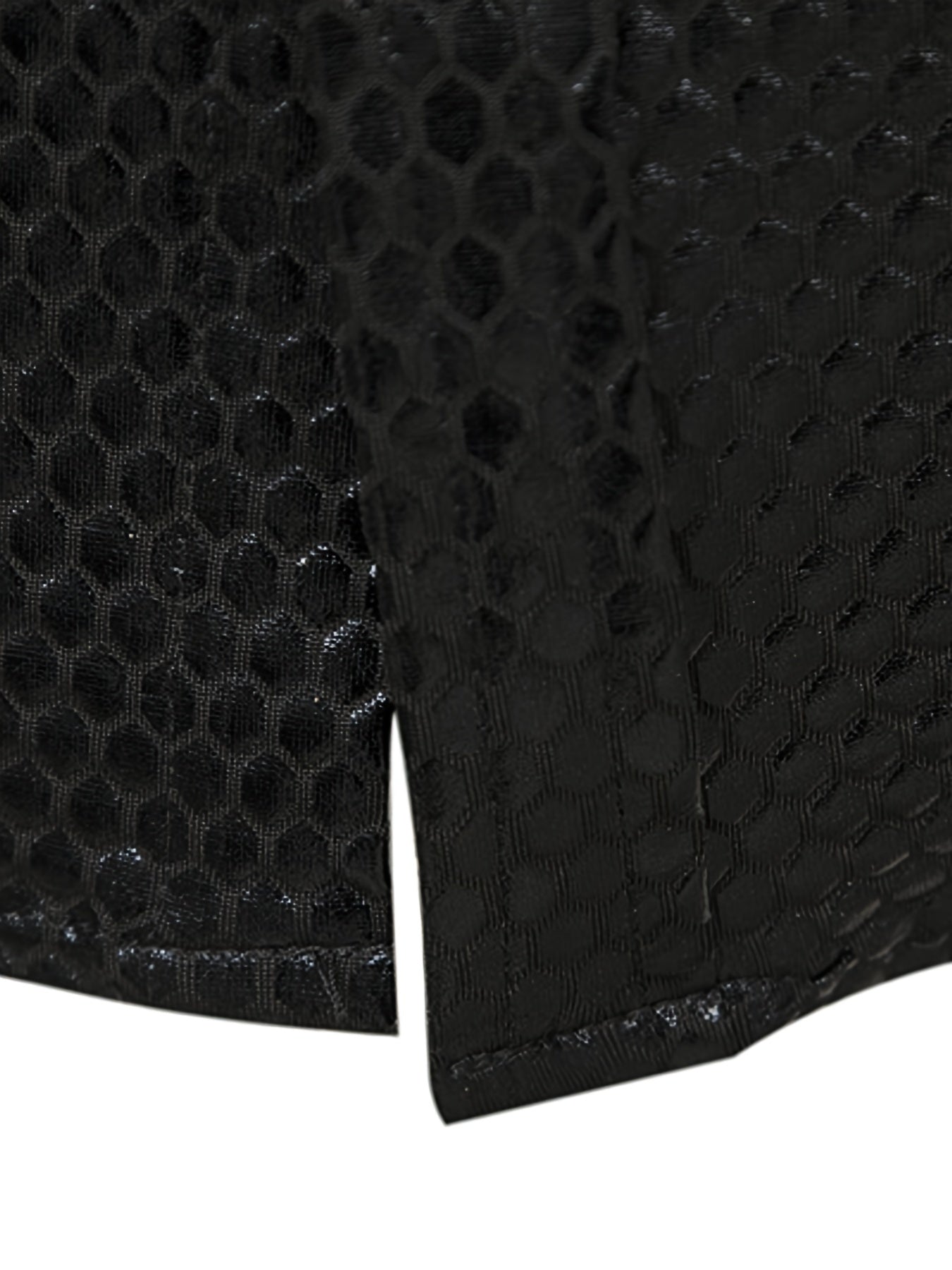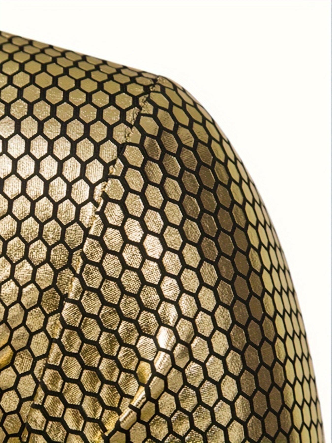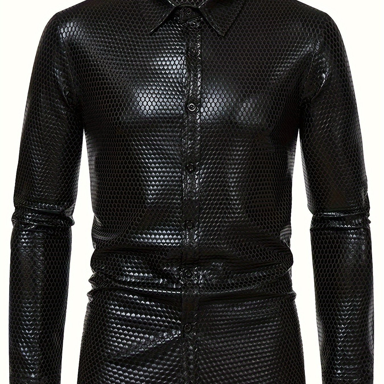 Retro party style with Men's 70s Disco Outfit! ✨ Featuring diamond foil print, long sleeve button-up shirt, skinny formfitting design, medium stretch fabric with 95% polyester and 5% spandex for festivals and retro fashion.
