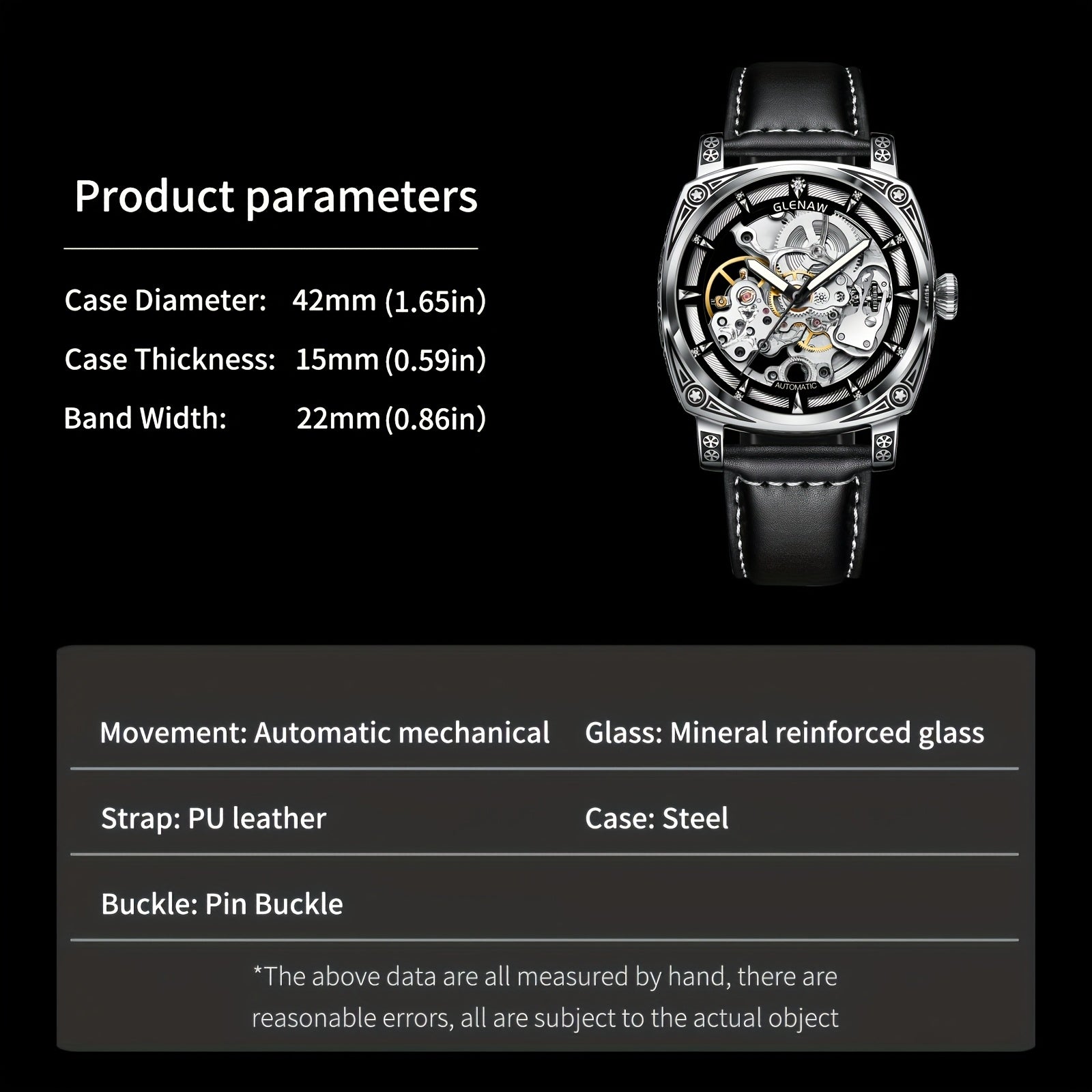 Shine with elegance with GLENAW Hollow Automatic Watch! ⌚ Featuring rhinestone dial, hollow automatic winding mechanical movement, oval shape, date function, vintage style, and PU leather strap with no battery required.