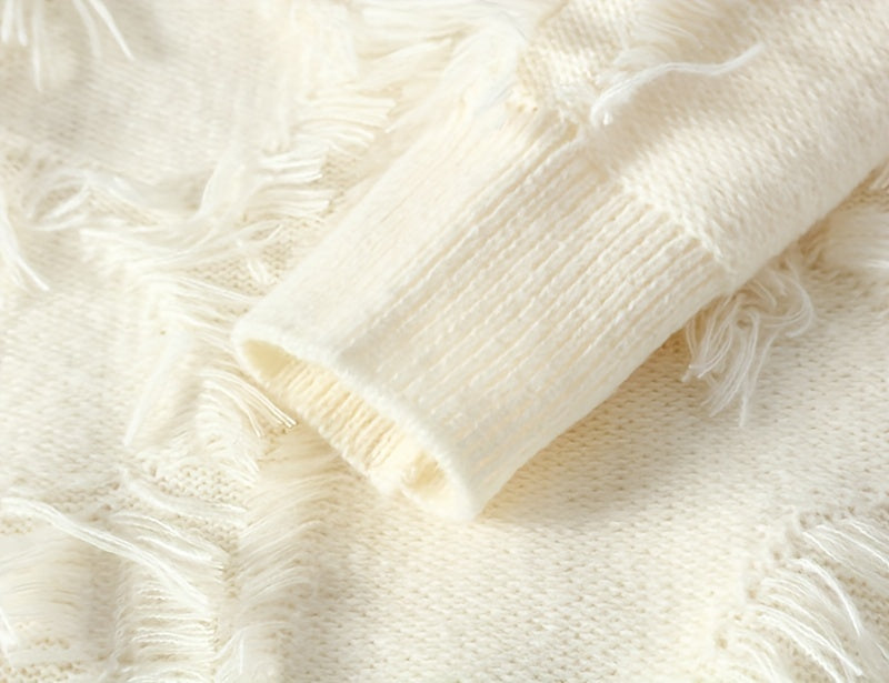 Stay stylish and comfortable with this Men's Casual Fringed Pullover Sweater! 🧶 Featuring high stretch knit fabric with unique ripped fringe details, this solid color sweater is perfect for all-season wear.