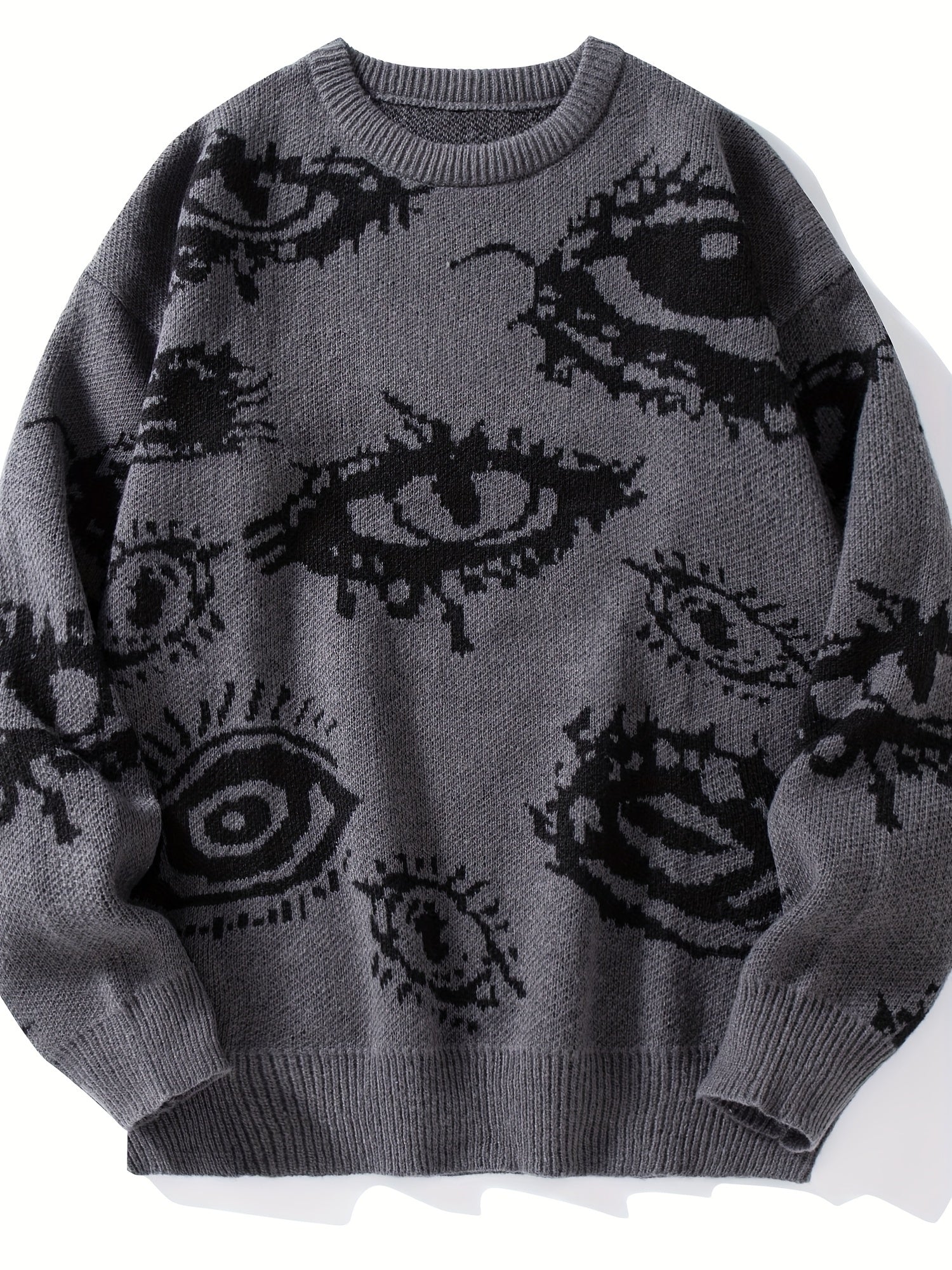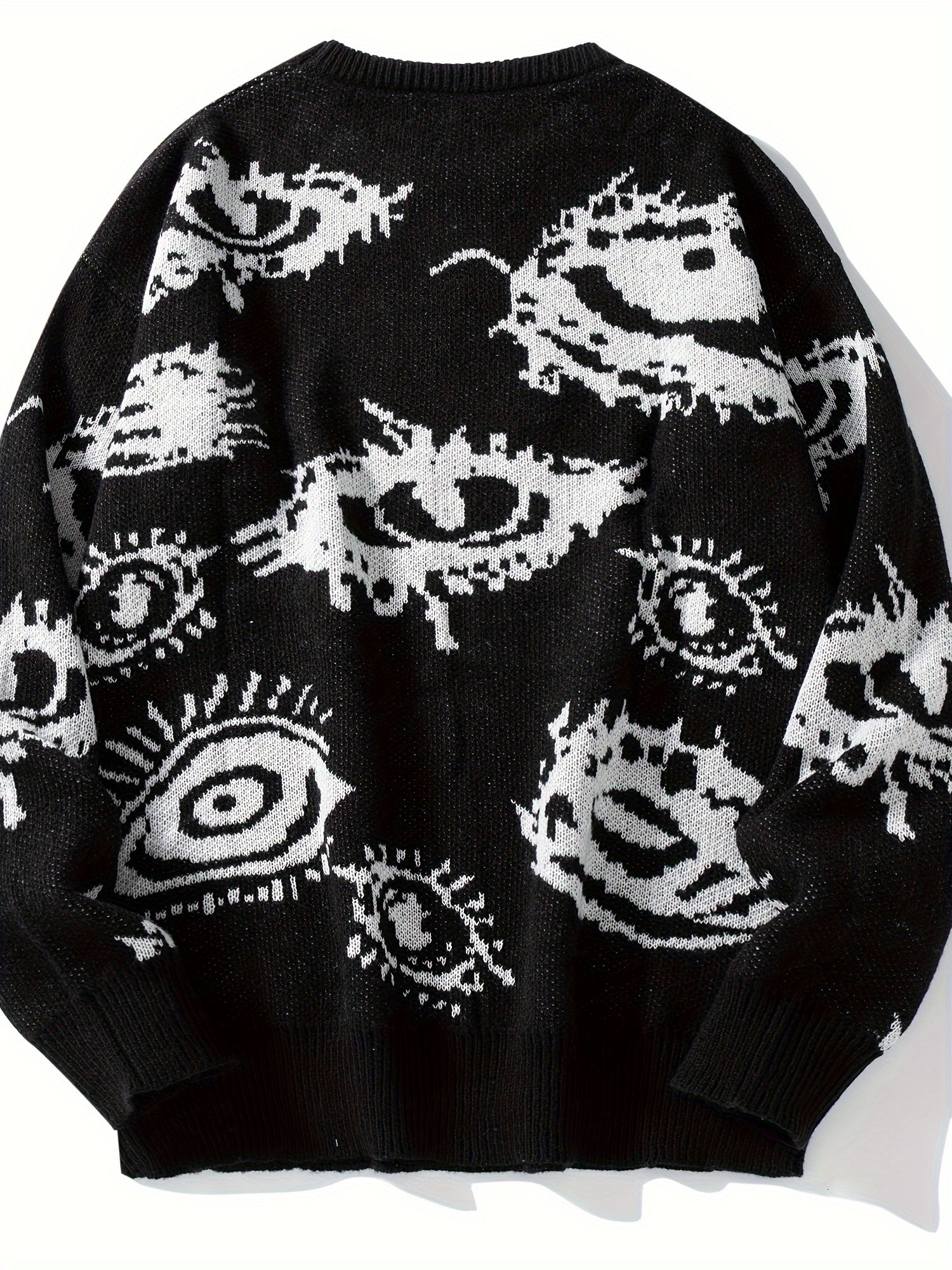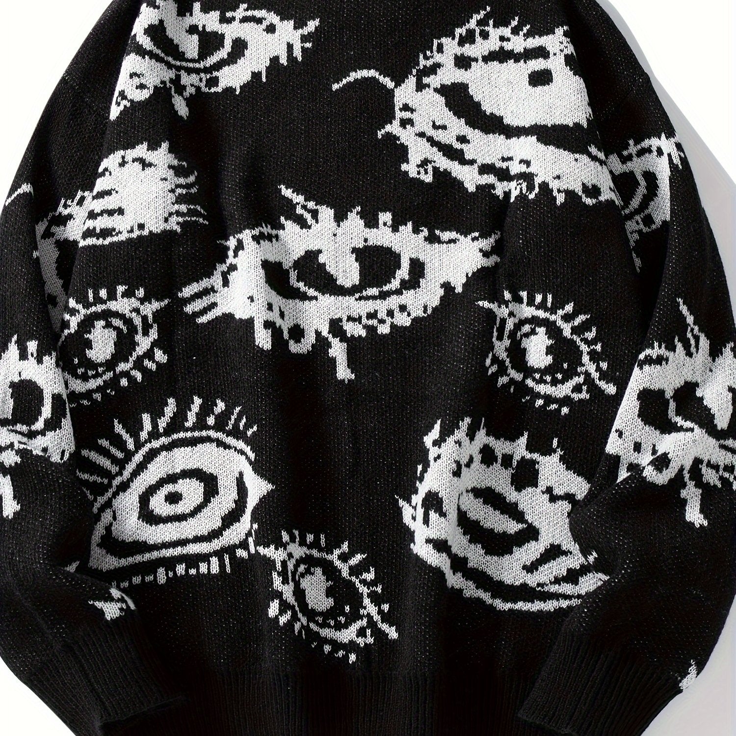 Bold design with Men's Geometric Eye Pattern Knit Sweater! 👁️ Featuring casual streetwear style, geometric eye pattern, high elasticity, long sleeve round neck pullover, black and white design, and 100% polyester for autumn and winter warmth.