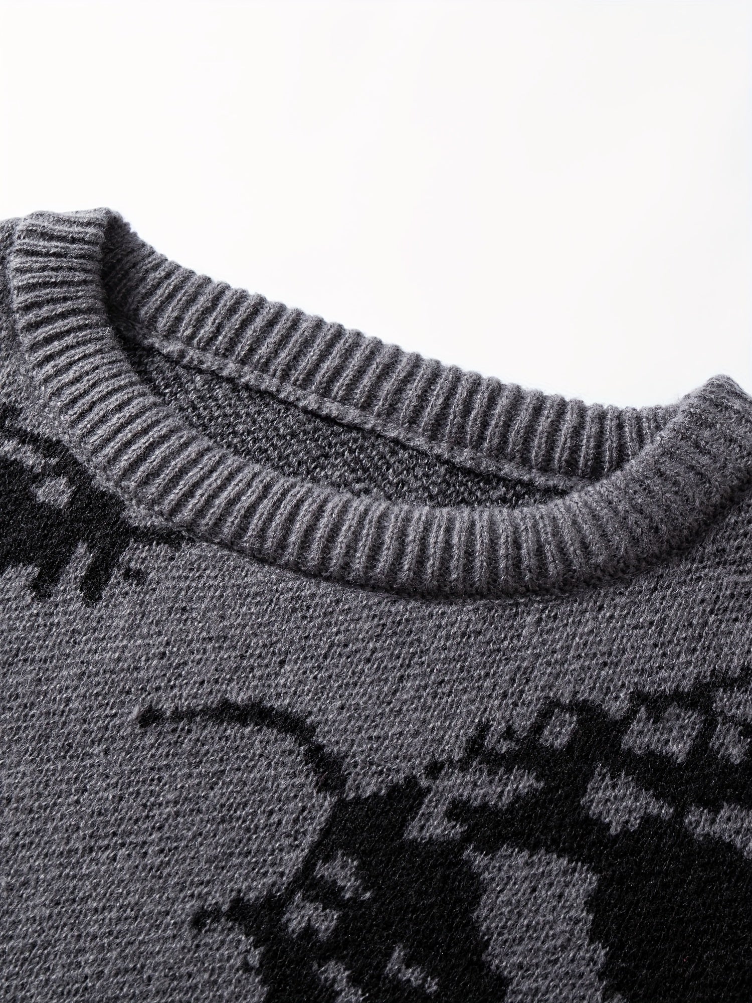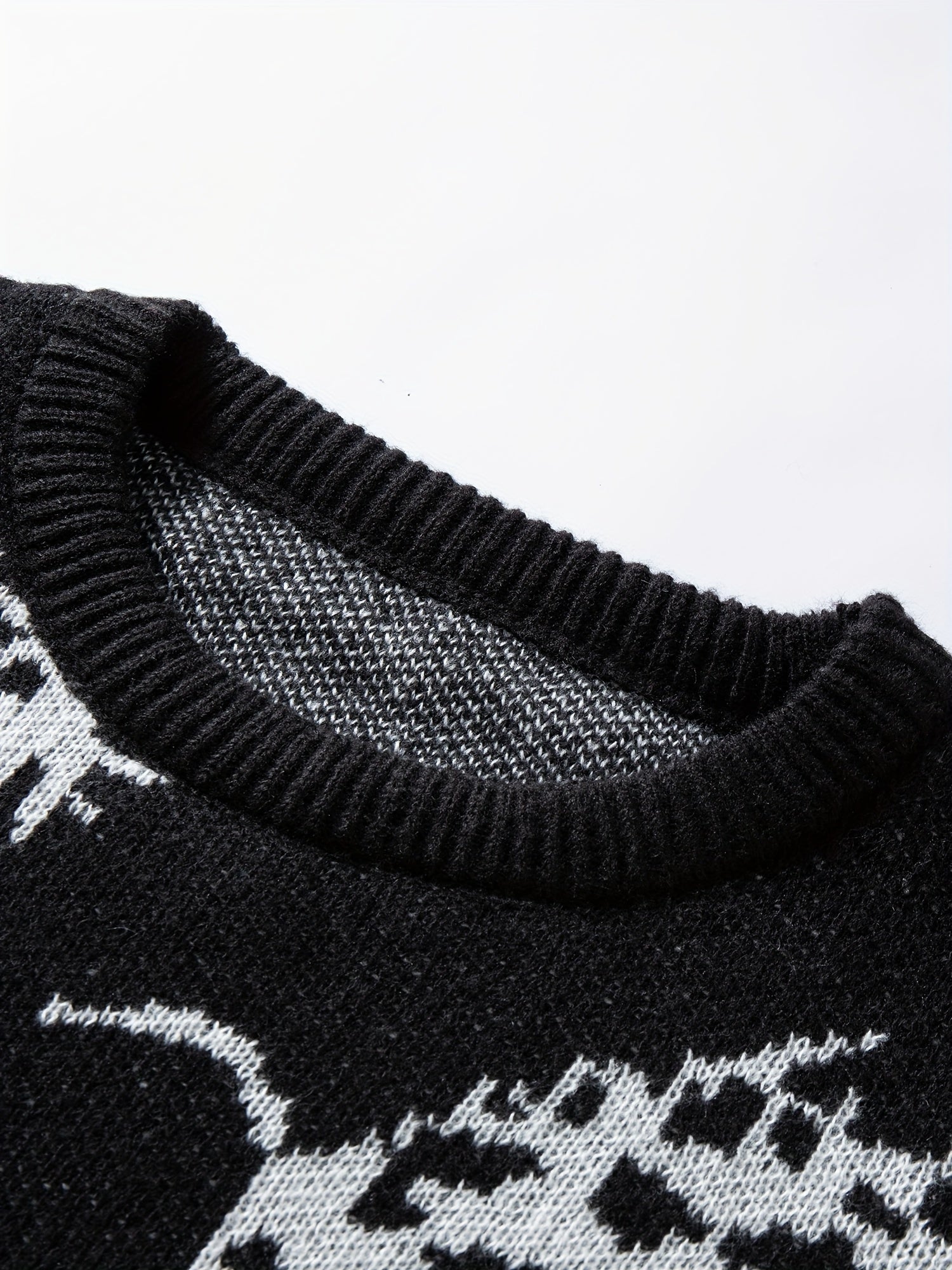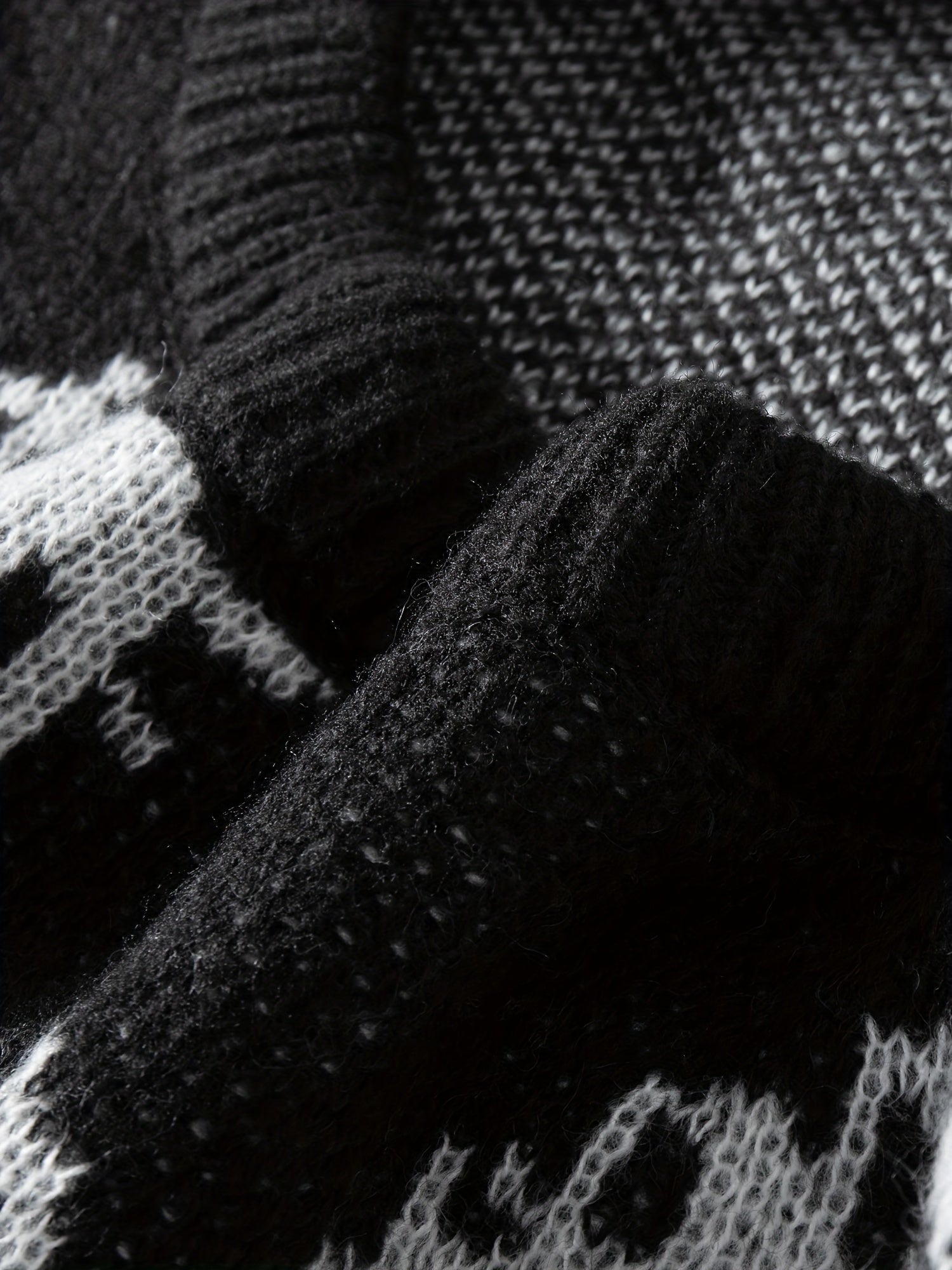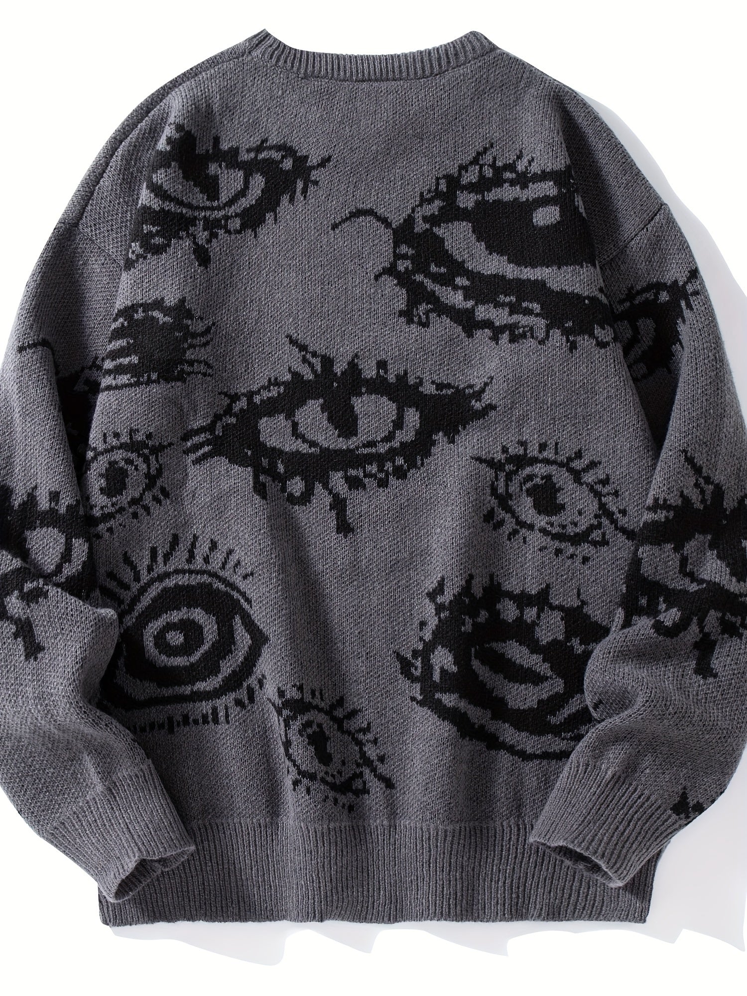Bold design with Men's Geometric Eye Pattern Knit Sweater! 👁️ Featuring casual streetwear style, geometric eye pattern, high elasticity, long sleeve round neck pullover, black and white design, and 100% polyester for autumn and winter warmth.