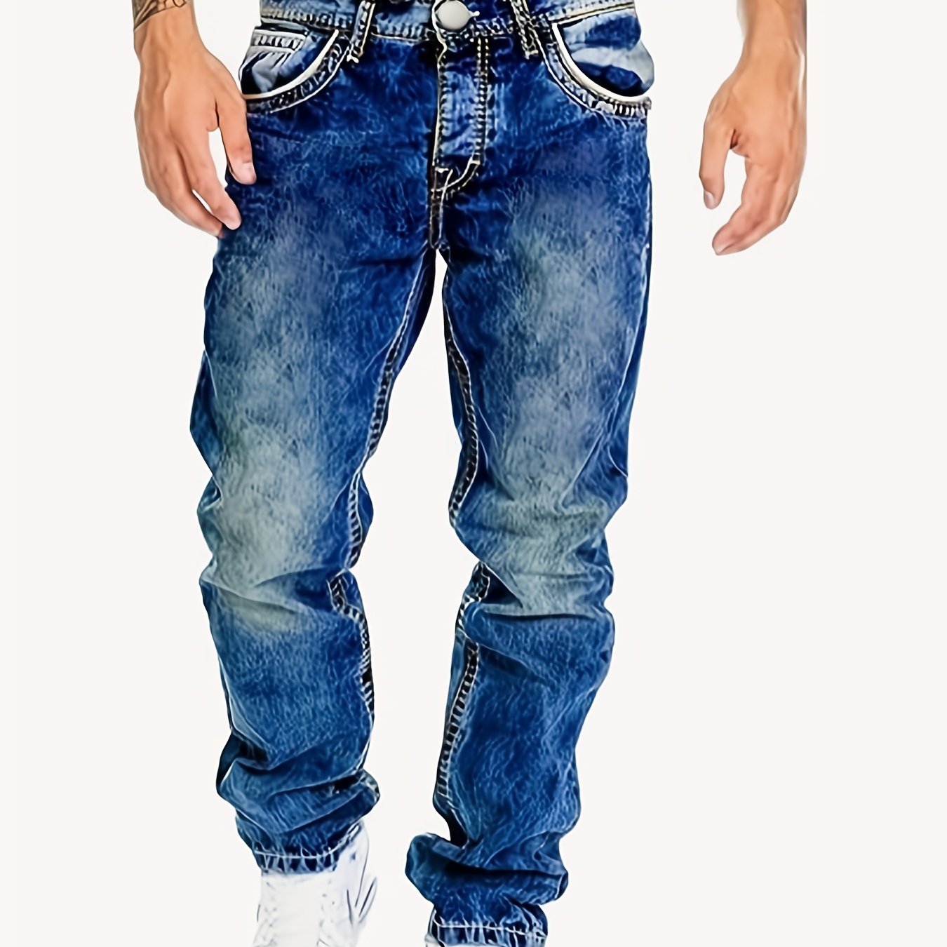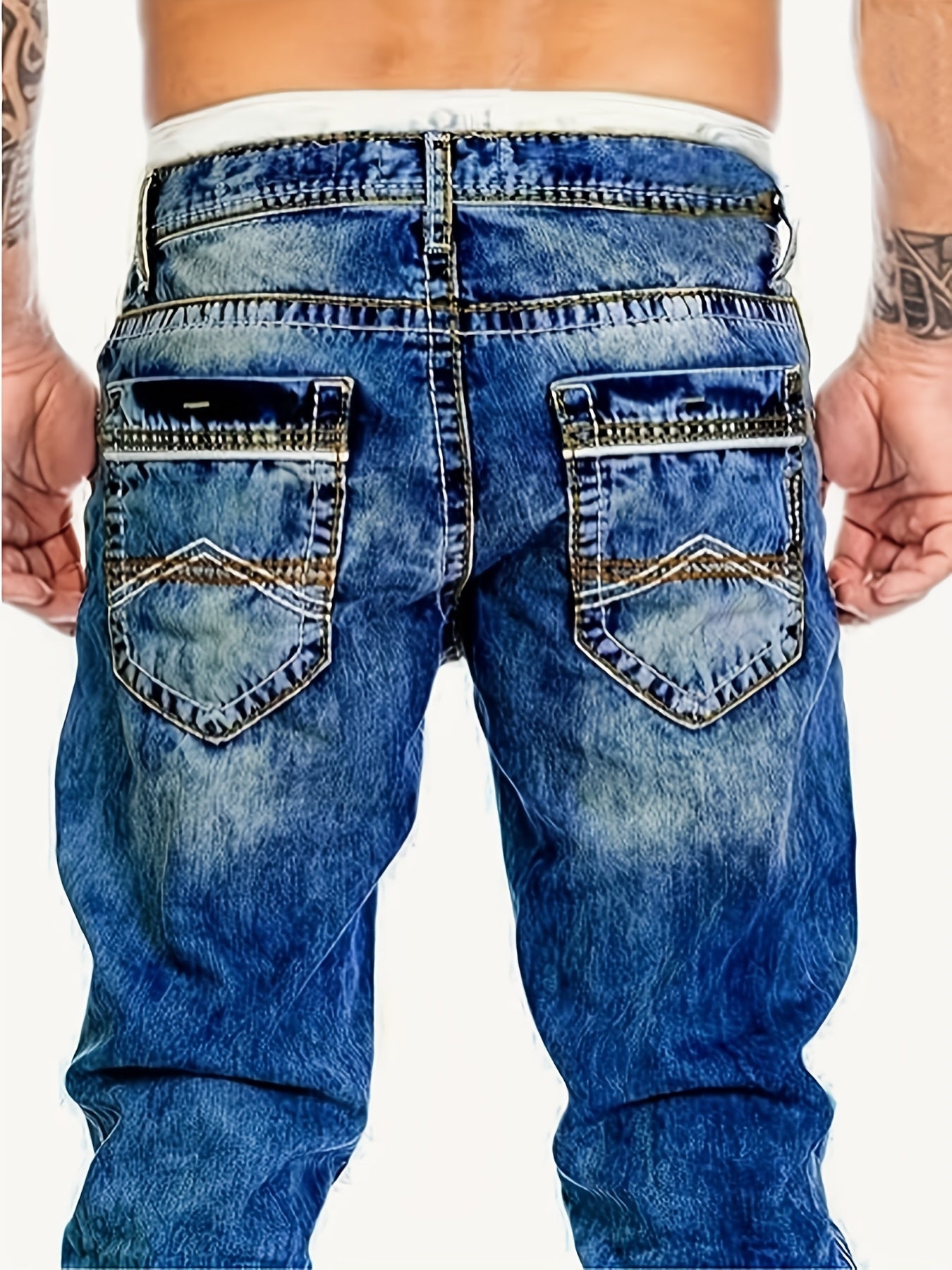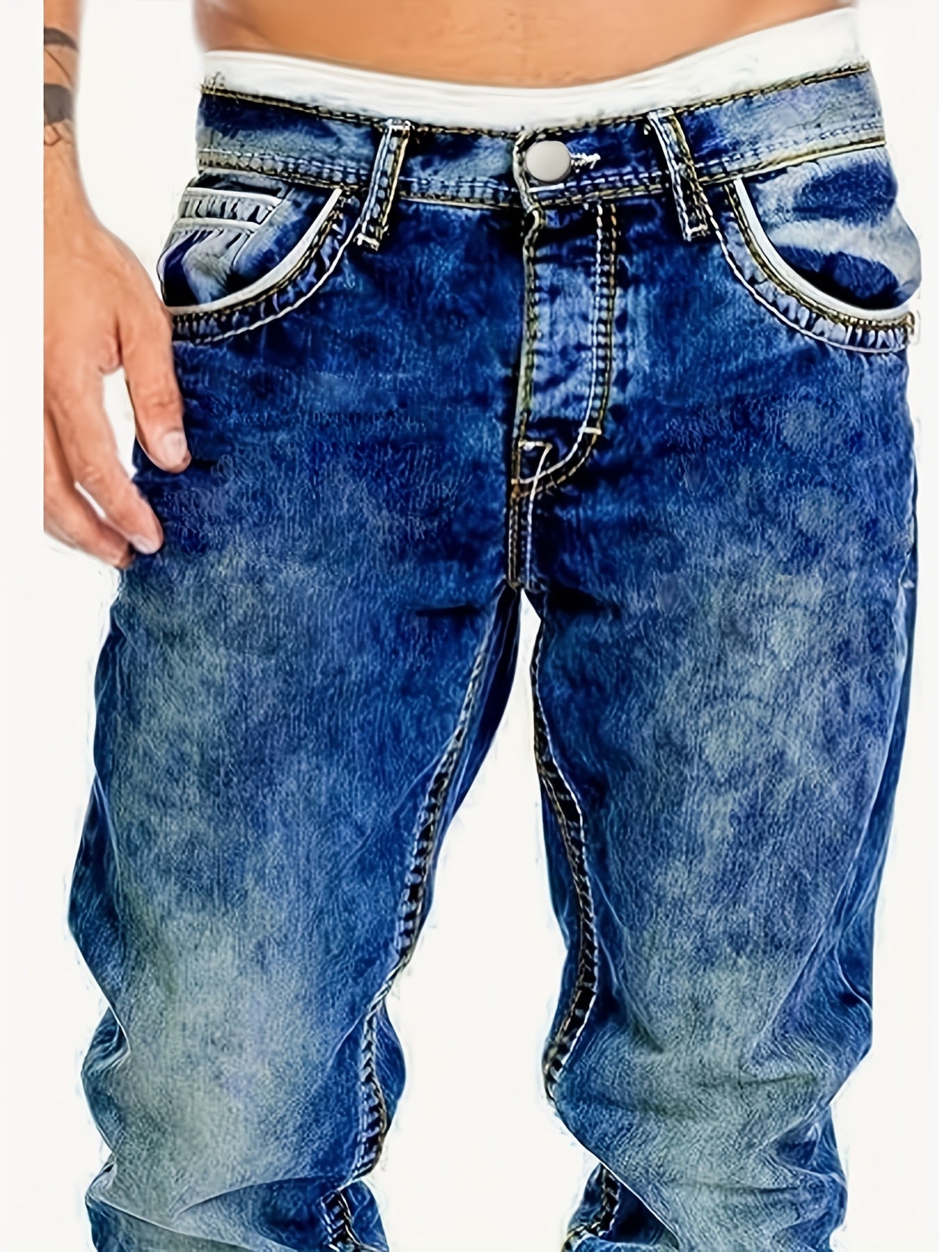 Classic casual style with Men's Casual Stretch Denim Jeans! 👖 Featuring distressed washed finish, regular fit, mid-rise design, medium stretch fabric with 75% cotton, 23% polyester, and 2% spandex for all-season comfort.