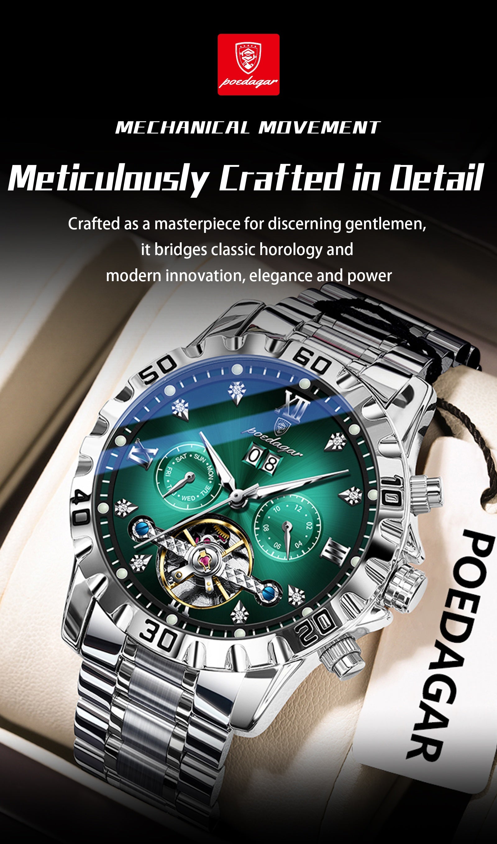 Elevate your business style with POEDAGAR Luxury Business Watch! ⌚ Featuring automatic self-winding movement, 3 ATM waterproof, luminescent hands, date display, skeleton design, stainless steel case and dial with no battery required.