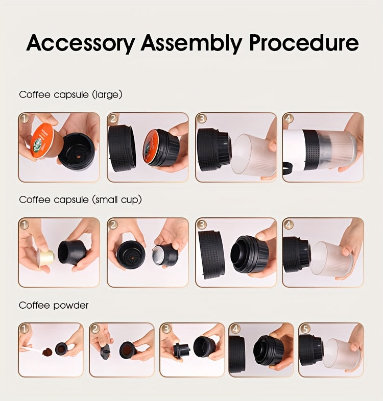 Coffee anywhere with Portable Electric Espresso Machine! ☕ Featuring compatibility for ground coffee and capsules, self-heating function, hot and cold brew, temperature control, compact travel design, USB charging, plastic construction, and perfect for camping, car, RV, and office.