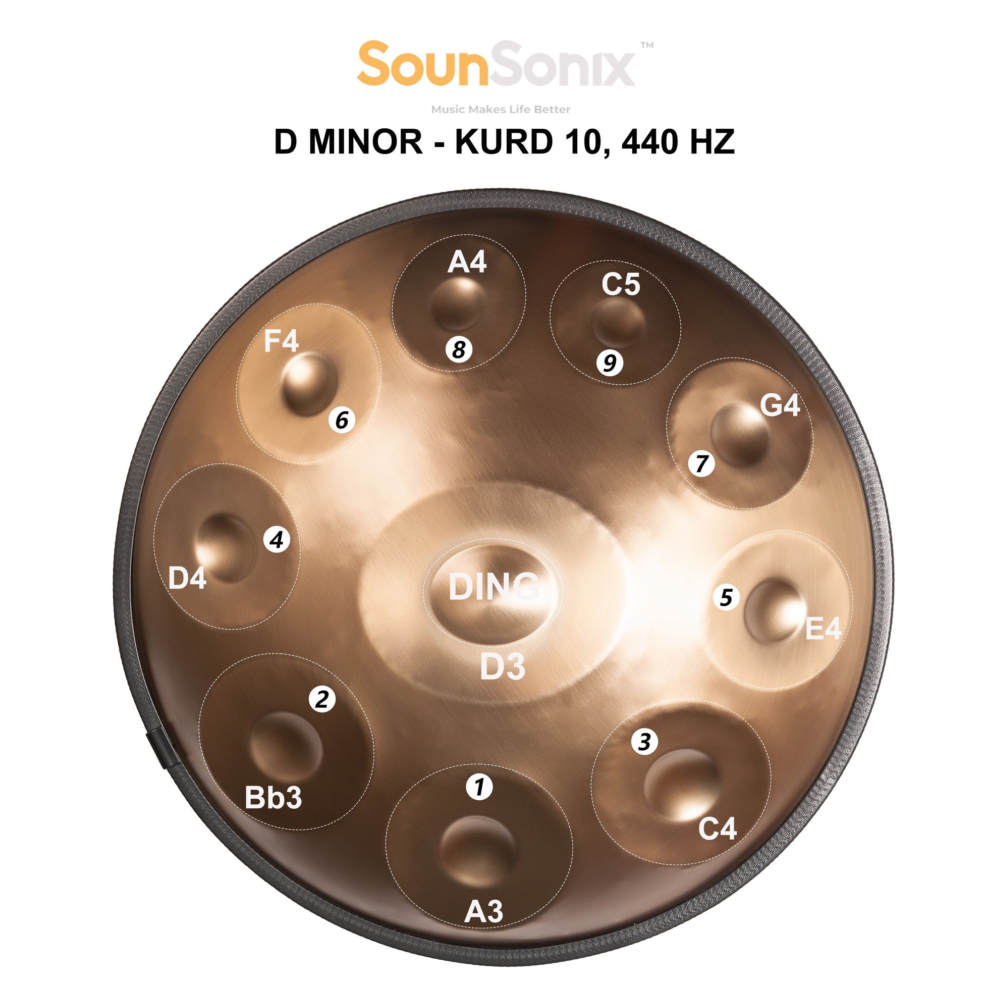 Handcrafted musical beauty with SOUNSONIX Handpan! 🥁 Featuring stainless steel AISI 430 construction, D Minor - Kurd 10 scale, 440 Hz tuning, 10 notes, 55.88cm size, golden color, and complete set with bag and stand for handcrafted steel hand pan drum.