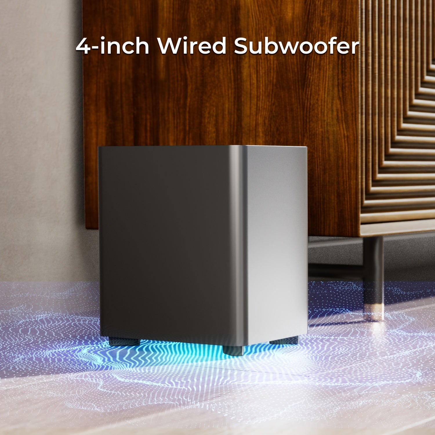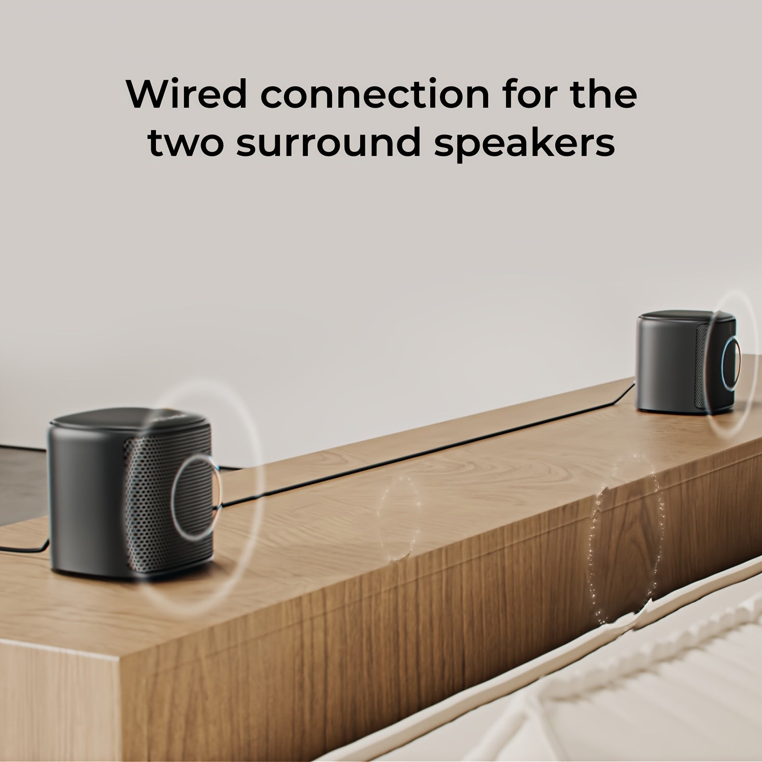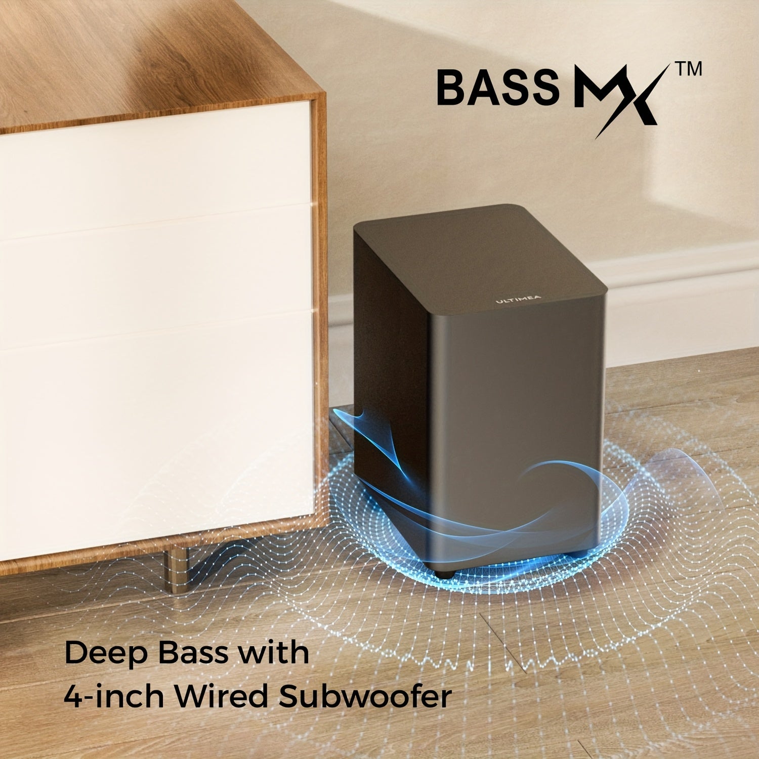 Immersive audio with ULTIMEA 7.1ch Surround Sound Bar! 🔊 Featuring 7.1 channel surround sound, 4 surround speakers, 330W peak power, app control, wired subwoofer, bass boost, and wireless/optical/AUX connectivity for smart TV and home theater.